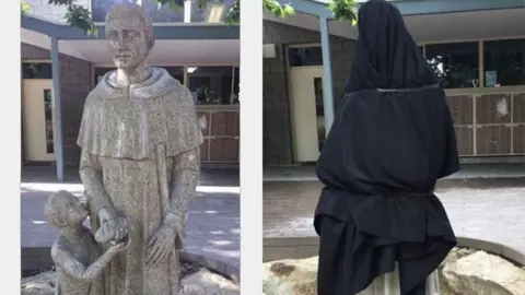 A Catholic boys school has been forced to cover up a brand new statue after a rather unfortunate design created a storm on social media.