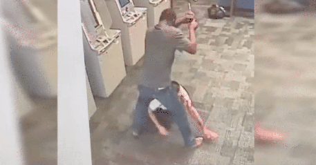 When the unidentified suspect is finished beating his victim, he smashes the screens of the cash-dispensing machines before walking away — and leaving the hatchet and his backpack behind, according to police.