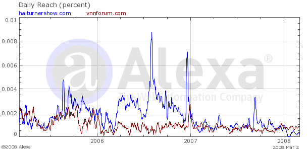 It seems despite the fact that Hal Turner has claimed to have the most popular White Nationalist Internet Website, Alexa.com, the most trusted popularity survey site, claims that VNNForum.com has overtaken Hal's popularity in 2008.