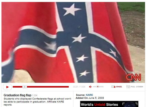 CNN has a new video report that illustrates the loss of European American civil rights.. Watch the CNN report (click photo above) about three boys who will now not be permitted to graduate with their classmates for simply sporting a Confederate flag on their car in the school parking lot. The school administrator calls the Confederate flag a hate symbol. If it is a hate symbol then so is the American flag, for the Confederate flag represented the democratic will of the South in declaring their independence from the North. The South did so exactly in the same fashion the colonies did against England. It is a symbol based on people having the right to determine freely their own government! The Confederate flag then is a symbol of freedom and self-determination! If it is a symbol of hate because a minority of Southerners owned slaves, then the American flag is also a symbol of hate because there were slaves in Northern states at the time of the War for Southern Independence. The American flag flew over the institution of slavery much longer than did the Confederate flag. It was never a symbol of slavery, it was symbol of Southern Independence.