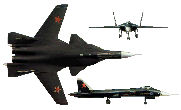This prototype (early known as S-32) is rather intended for experimental development of those technological decisions that can be really employed on future combat aircraft of the Sukhoi family. In any case, in connection with an extremely difficult situation of the Russian aircraft industry, the S-37 aircraft is faced with a hard road to go from a prototype to the fully-fledged fighter. As always, the demonstration of the earlier secret new product arouses many questions to which representatives of the Sukhoi Design Bureau have for well-known reasons a standard answer “No comments”. In particular, unknown is the purpose of the new aircraft, its flight characteristics, level of the craft’s outfit with standard armament and equipment. At the same time, Lieutenant-Gen-eral Yuri Klishin, deputy commander-in-chief of the Air Force in charge of armament, has pointed out at the MAKS’97 airshow that the Russian aircraft of the fifth generation will be a multi-role one. That means that apart from accomplishing mission of a pure fighter, the new aircraft will be able in future to deliver strikes at ground targets with the help of state-of-the art high-precision weapons. Proceeding from possible missions that Russia’s Air Force is to set before the fighter of the fifth generation, the list of technical features developed on the S-37 are sure to include low radar signature, supersonic cruising flight speed at the engines non-afterburner operation mode and provision of maneuverability over the wide range of the speed range. The S-37’s configuration is unusual for the aircraft of the Sukhoi family as it employs a forward swept wing (FSW). According to the deputy head of the Central Aerohydrodynamic Institute (TsAGI), Valery Sukhanov, the employment of FSW will give the future combat Russian aircraft the following advantages: raise aerodynamic characteristics and especially maneuverability at subsonic flight speeds, improve controllability at high angles of attack, in-crease the flight range through FSW’s high lift qualities, raise take-off and landing characteristics. Besides, FSW has lower radar signature from the for-ward hemisphere. Valeri Sukhanov has declined to comment on reports about flight tests of the S-37. However, he has said that in the 1980s work in this direction in the USSR and the US was going on practically in parallel. Due to objective circumstances connected with the beginning of restructuring in the former USSR, work on FSW substantially slowed down. At the same time American specialists, who had conducted in the 1980s a cycle of flight tests of twoX-29A with FSW, gave up the idea of using such a wing on serial combat aircraft of the fifth generation because of major technical risks. As of today, TsAGI’s scientists have accomplished a large volume of theoretical research of FSW. This research have confirmed the possibility of employing of a such wing on supersonic flight modes. At the same time, the necessity has been established of resolving of a number of problems related to strength of such a wing and reinforcing its structure because of the influence of high loads. At present, with the development of technologies of composite materials, is possible to solve the task of developing a highly loaded light high-strength FSW, Sukhanov has pointed out. In his view, the beginning of experimental development of the FSW concept on S-37 is a topical task and is to contribute to the shaping of the scientific and technical potential for future Russian aircraft. The new Sukhoi prototype is con-figured as an integral triplane equipped with forward canards. The forward-swept wing is 90% of composite materials.
