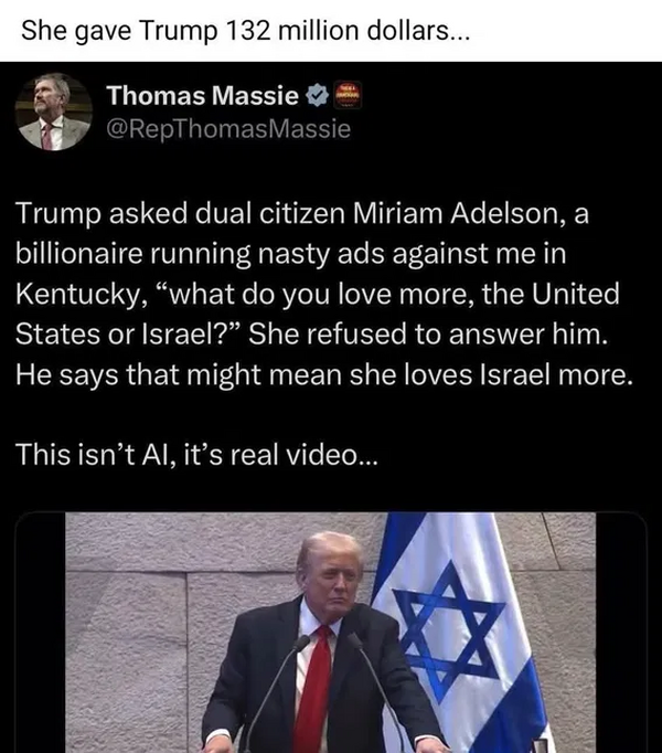 President Trump, who is working in cahoots with Israel First billionaires to oust beloved Kentucky Rep. Thomas Massie, endorsed Ed Gallrein on Friday to take on Massie, even though he has yet to enter the race.