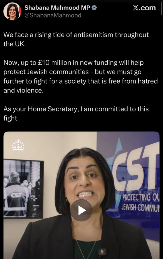 We face a rising tide of antisemitism throughout the UK. Now, up to £10 million in new funding will help protect Jewish communities - but we must go further to fight for a society that is free from hatred and violence. As your Home Secretary, I am committed to this fight.
