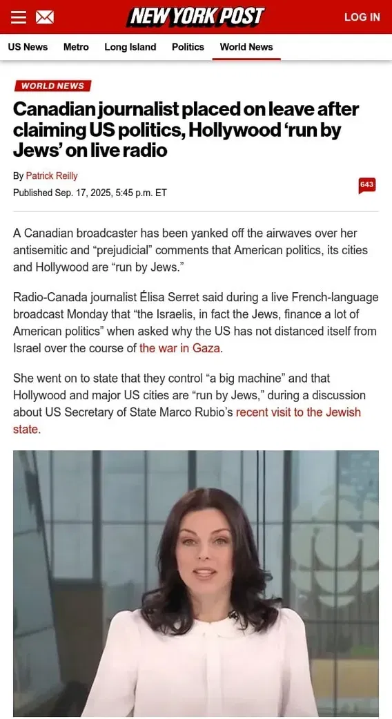 Radio-Canada journalist Élisa Serret said during a live French-language broadcast Monday that “the Israelis, in fact the Jews, finance a lot of American politics” when asked why the US has not distanced itself from Israel over the course of the war in Gaza.