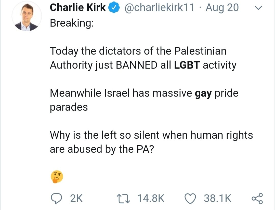 "Jewish donors play into all the stereotypes," Kirk continued. "I cannot and will not be bullied like this. Leaving me no choice but to leave the pro Israel cause."