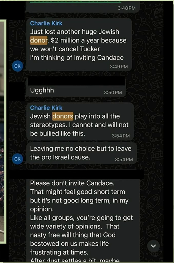 "Just lost another huge Jewish donor," Kirk wrote in a private group chat. "$2 million a year because we won't cancel Tucker. I'm thinking of inviting Candace."